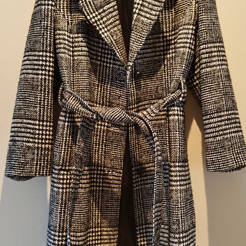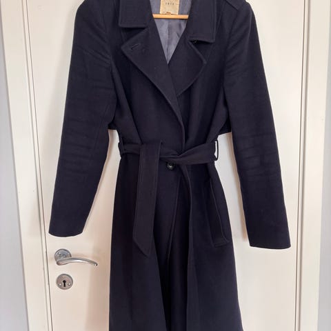 Days Like This lettkåpe i blå farge, størrelse 36.Plagget har et mønster med geometrisk design og inkluderer et belte. Egnet som yttertøy for ulike anledninger i tidlig høst eller sen vår.