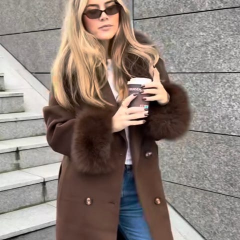 God og varm ullkåpe fra L.cuppini i 30% Kashmir og 70% ull. Avtagbar pels på hetten og knyting i livet. Passer XS-M, den er vid i passformen.