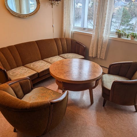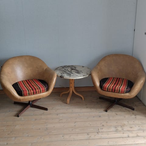 Førstemann til mølla .kule svingstoler fra 60 tallet med normal slitasje. Den ene har sprukket litt opp på armlenet. Trenger nok litt omsorg.