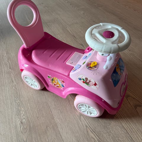 Disney Mickey Mouse Ride-On Bil for barn i rød, gul og svart. Laget av plastmateriale med fire hjul og ratt for styring. Designet med Mickey Mouse-tema, inkludert ører og ansikt på fronten. Passer for små barn som en leke- og treningsbil.