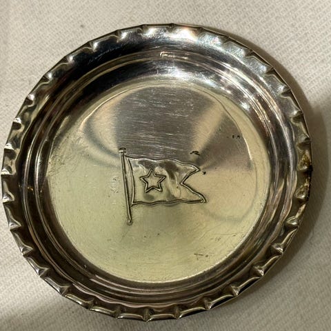 Gammelt askebeger med mynter selges. Noe bruksmerker kan forekomme. Selges som det er. Se bilder.