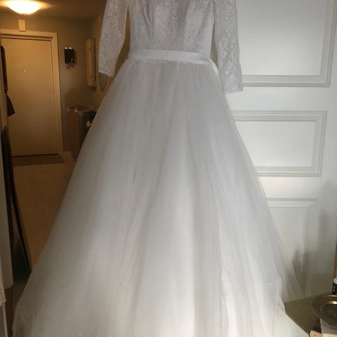 Hvit brudekjole med blonder og 3/4 lang arm. Broderte hvite blomster. Ikke brukt. Str. 42-44.