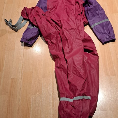 Pent brukt brannbil regntøy str 4 år, bilene på jakka har blitt litt misfarget i vask, ellers helt og pent!