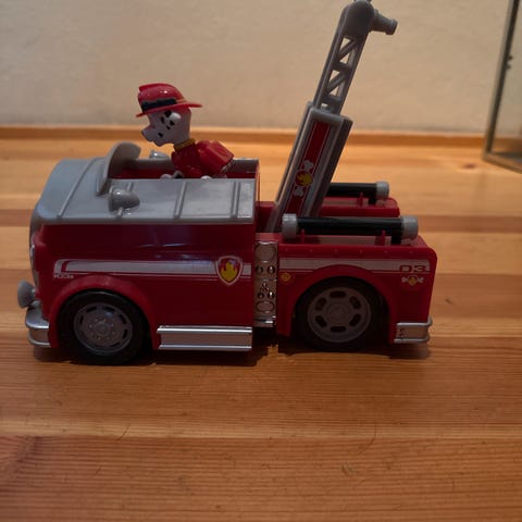 Marshall fra Paw patrol brannbil selges. Man kan trykke på en knapp så blir den lenger og man får opp en stige også. Er lyd påbilen, men funker ikke nå. Mulig batteribytte gjør saken bedre