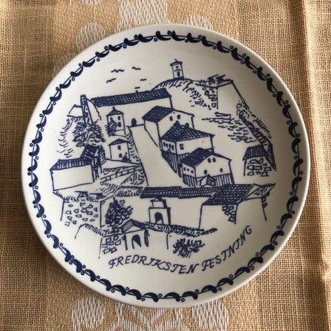 Tallerkenen har motiv av Kongens Port i Fredrikstad, med detaljer som festningsbyen og tårnet på Fredrikstad domkirke i bakgrunnen.