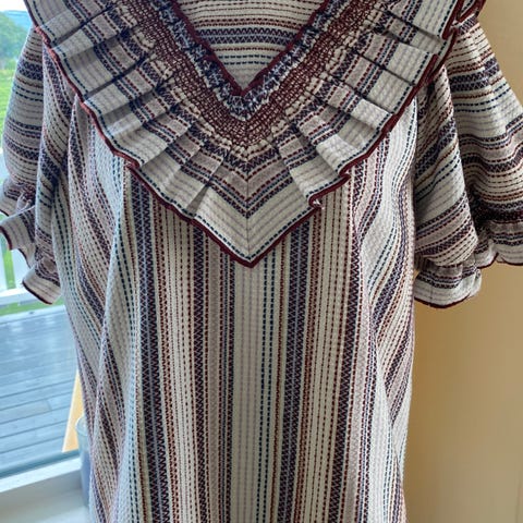 Vintage-stil bluse med skjørt fra Culture i størrelse S. Den har en dekorativ krage og er prydet med striper i grønn og burgunder. Perfekt til både jeans for en avslappet look eller til en mer elegant underdel.