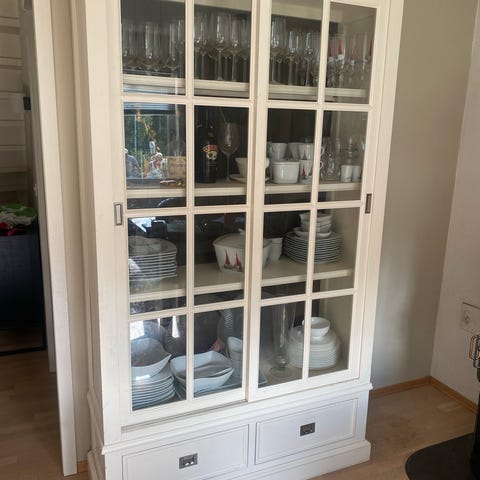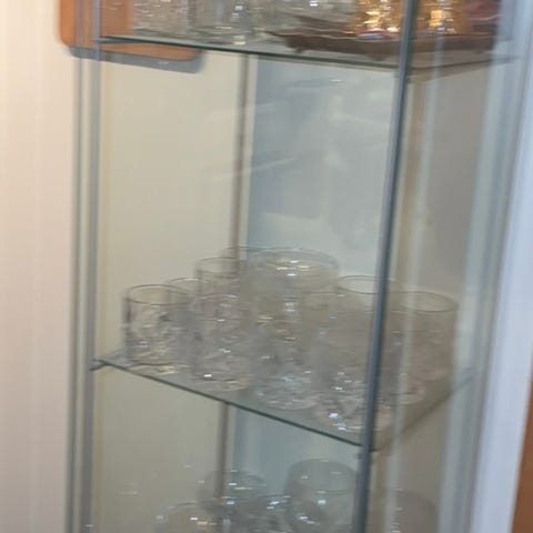 Moderne og pent vitrineskap i hvitt med glassdør og en glasshylle.