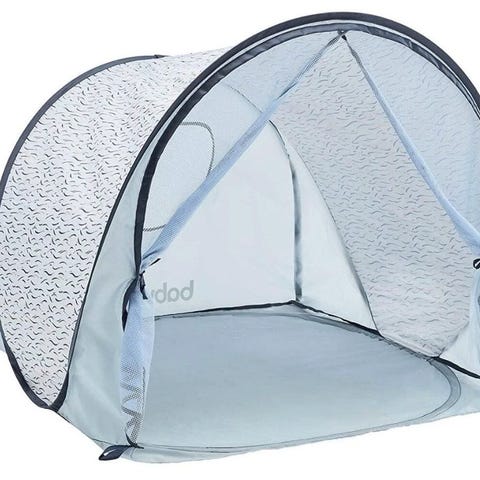 Babymoov Soltelt for baby med blå og hvite striper. Teltet gir UV-beskyttelse med faktor 50+ og er egnet for bruk fra 0 måneder og oppover. Designet for å gi skygge og beskyttelse under utendørsaktiviteter for små barn.