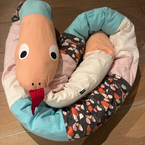 Hjemmelaget sengeslange ca.2,90 meter lang. Den er i fin stand og laget med stofftyper med fine motiver som passer godt på barnerommet.