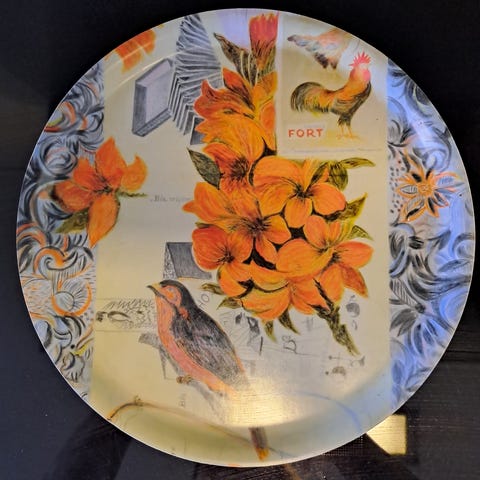 Liten firkantet plate/ bord skåner med en størrelse på 25 cm i diameter. Tallerkenen er hvit med et grønt dekorativt motiv av grønnsaker og planter. Materialet er keramikk. Passer til servering av småretter eller som dekorativt fat.