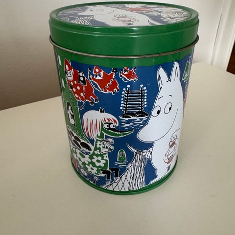 Kaffeboks med motiv fra mummi. Mummimamma og teksten kaffe på ulike språk.