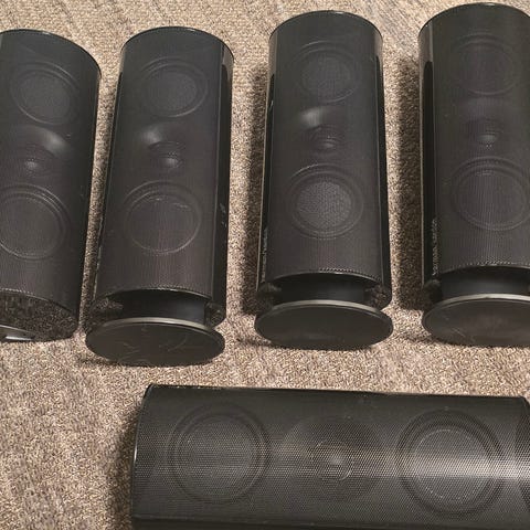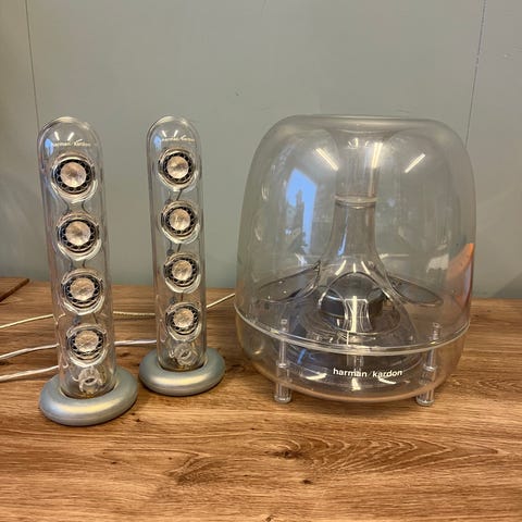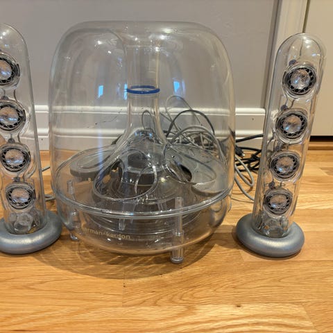 Harman Kardon Soundsticks 4 er et høyttalersystem med et unikt design i transparent materiale. Systemet inkluderer en subwoofer og to satellitthøyttalere. Fått mye skryt for både design og lydkvalitet. Kan kobles til avspillingsenheten enten med kabel eller Bluetooth. Da disse aldri har kommet i salg i Norge, ble settet bestilt fra B&H i USA (kvittering kan sendes). Medfølger overgang til norsk stikkontakt.
