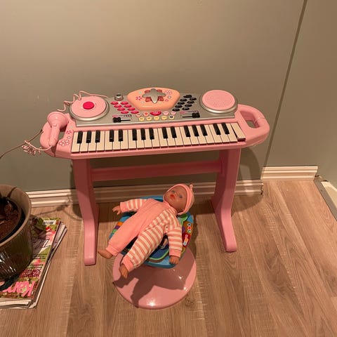 Fisher-Price leketastatur med 32 tangenter, flere knapper for lyd- og lysfunksjoner, samt innebygde høyttalere. Laget i plast med rød, hvit og svart farge. Egnet for barn som ønsker å utforske musikk og lyd.