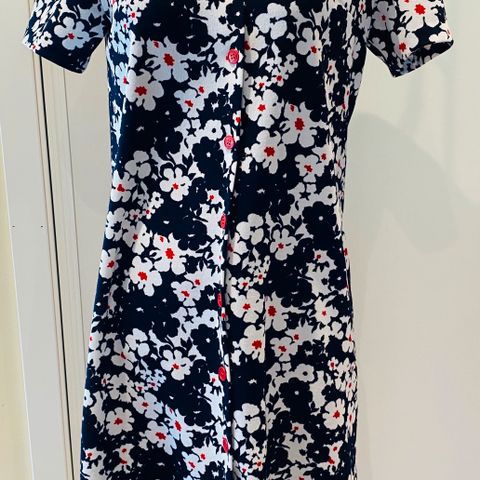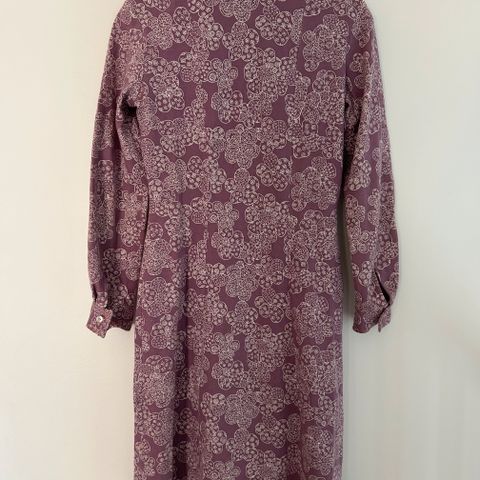 60- 70- talls kjole som ble brukt som forklede ved matlaging. Kan sys om til kjole eller skjørt. Veldig fint mønster og farge for de som vil sy pute, duk eller noe annet morsomt.