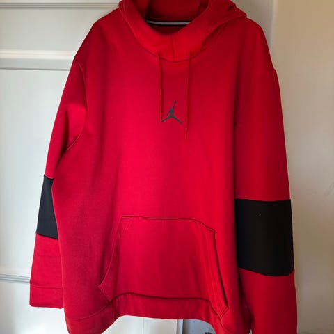 Nike Jordan hettegenser for herre i størrelse XL. Genseren er grå med svart hette og detaljer, laget av et materiale som gir komfort og varme. Passer til hverdagsbruk og sport.