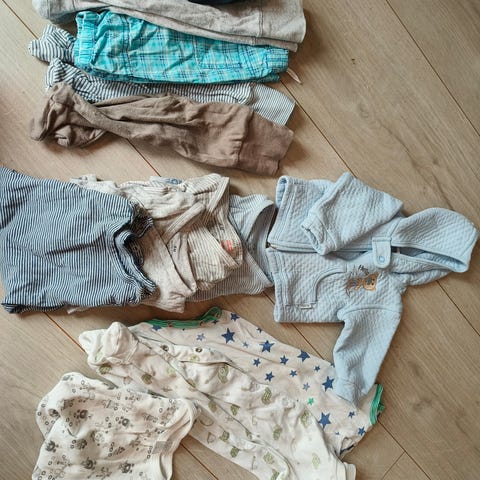 11 bukser, 8 kortermet bodyer, 1 genser, 8 langermet bodyer, 13 par sokker, tøfler, 2 par votter, 1 sommerpysj og ett sommersett. Noe bruksmerker.