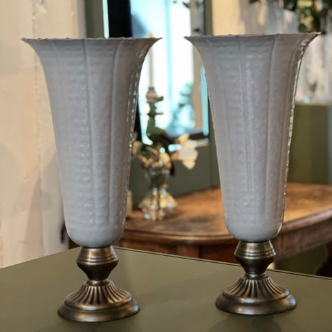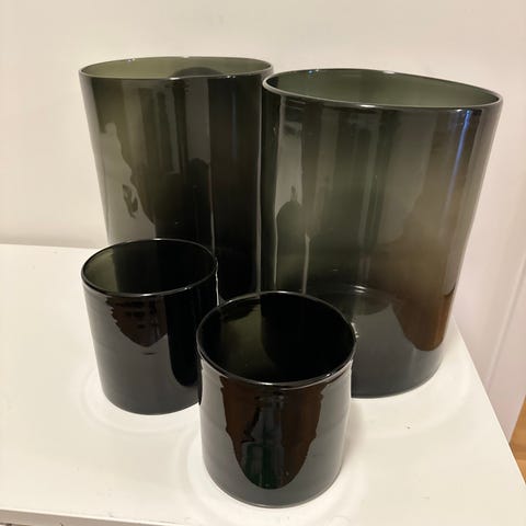 50 vaser totalt, i tre ulike størrelser. 25 store vaser som er ca. 17 cm høye og 25 små vaser, hvorav 4 stykker er 13 cm og resten er 8 og 9 cm. To ulike typer vaser som passer godt til hverandre.