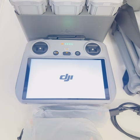 DJI Air 3 drone med fjernkontroll, ekstra batteri og bæreveske. Dronen har foldbare armer og innebygd kamera. Fjernkontrollen har innebygd skjerm for sanntidsvisning og kontroll. Batteriene er oppladbare og kompatible med dronen. Bærevesken har plass til drone, fjernkontroll og tilbehør.