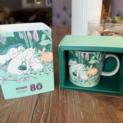 Koppen har også et unikt motiv på innsiden, der Mummitrollet og Mummimamma klatrer opp en stige, samt Moomin 80-jubileumsstempelet på undersiden. Koppen leveres i en eksklusiv gaveeske pyntet med flotte Moomin 80 grafiske detaljer.