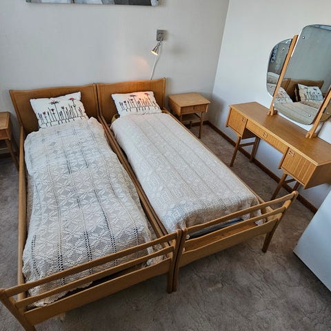 Seng, skap, kommode, speil, sminkebord, nattbord, ramme.