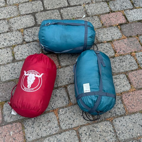 Anylett Veidemann sovepose til voksen, snøring oppe, med oppbevarings trekk. Blå på utsiden og rødt for. Brukt 1 gang. 210 cm lang, 69 cm bred oppe og 49 cm bred nede