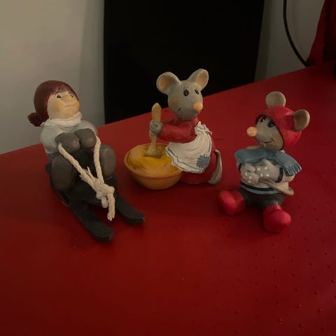 Trolig hjemmelaget, alder ukjent. Dus grønn med røde stolper. Fin til utstilling og dekorasjon? Lengde: 59 cm, bredde 25,5 cm, høyde 26,5