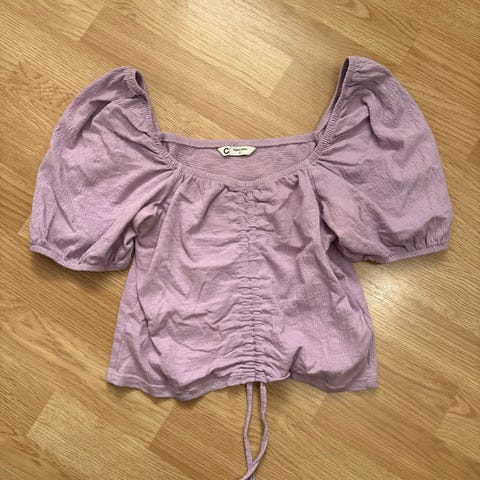 Søt lilla topp fra Cubus. Størrelse er S. Kan strammes med snorene slik at fasongen blir etter eget ønske. Er brukt, men har ingen synlige bruksmerker.