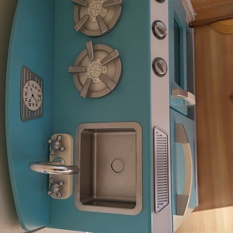 IKEA lekekjøkken laget i tre med hvite fronter og svart vask og kokeplate. Kjøkkenet har to dører, en åpen hylle og en hylle over vasken. Passer for barn til lek og læring. Må hentes på Valderøya. Greit å vite at lys på en av de kokeplatene lyser ikke.