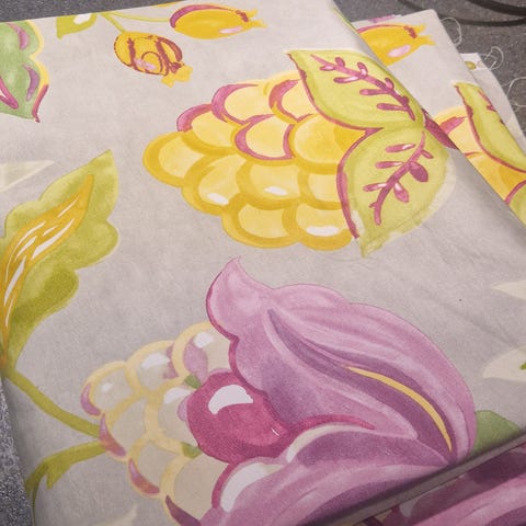 Dette er et teppe som jeg har håndsydd i lappeteknikk. Sy-teknikken heter «håndsøm over papp» og i tillegg er det en god del med hånd-applikering på teppet. Jeg har quiltet teppet på min maskin. Har brukt absolutt de beste kvalitets bomullstoff. Stoffene har jeg forhåndsvasket. Teppet er vattert; vatten består av 80% bomull og 20% polyester.