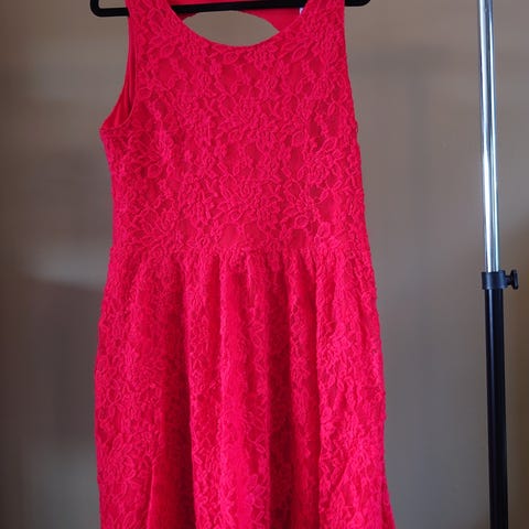 Oasis rød kjole i størrelse 38. Kjolen har blondedetaljer øverst, ingen ermer og innsving i midjen.