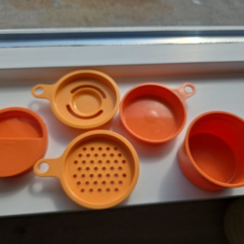 Lyserosa målebeger fra Tupperware i amerikansk måleenhet cups