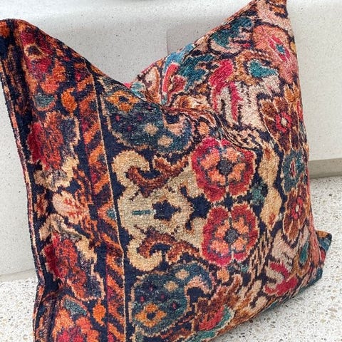 Innerputen består av fjær og dun. Denne puten matcher et quiltet teppe sydd i lappeteknikk, som også er til salgs og ligger på egen annonse på Finn.no
