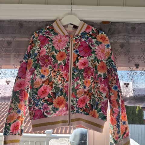 Søt og blomstrete jakke. Noen flekker foran og bak som helt sikkert kan vaskes bort. Blitt vasket med flekkfjerner 1 gang. Ellers er det mye bruk igjen i jakken. Ser ikke noen flere eventuelle bruksmerker