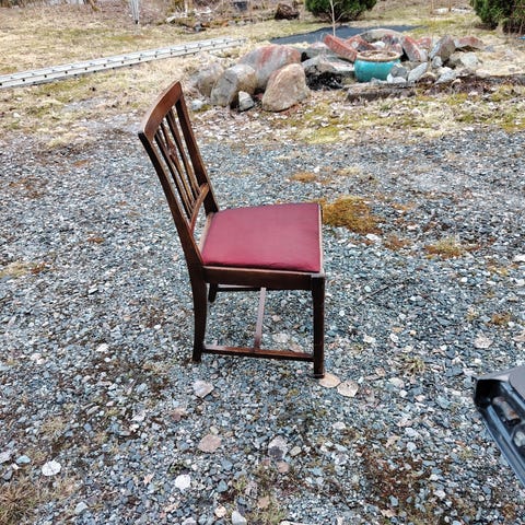 Gamle spisestue stoler selges. Den ene mangler vippe-knotten under.