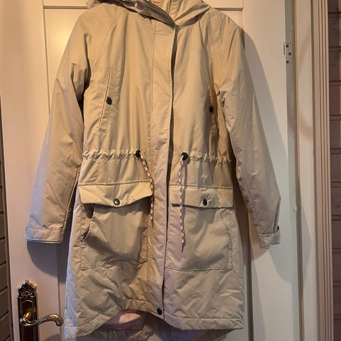 Selger denne fine regnkåpen fra Didrikson. Str 42. Jakken er pent brukt og har veldig få bruksmerker til tross for den hvite fargen. Prøvd å ta bilder av små flekker og steder hvor det har kommet litt farge av. Lite synlig generelt sett. Inni har det tynne stoffet fått litt nupper og bruksmerker, se bilder. Har ingenting å si for bruken :)
