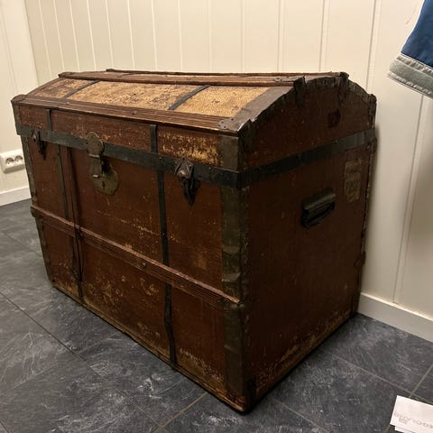 Antikk reise kiste i tre med metallbeslag