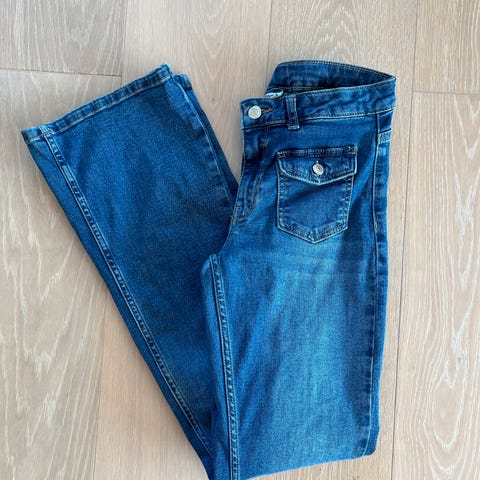 En lys jeans loose fit - mid waist str 164 pent brukt, og en mørk blå jeans straight jeans- mid waist str 164 pent brukt. Begge fra KappAhl. Knapp i livet, glidelås. Stramming er mulig med strikk på innsiden i livet. Sender gjerne.