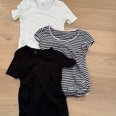 4 amme t-shorter. 3 av de er kun vasket og aldri brukt. Den stripete ble brukt 3 ganger. Alle 4 er i str XS. Selges samlet og sendes mot frakt med mindre kjøper kan hente.