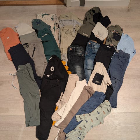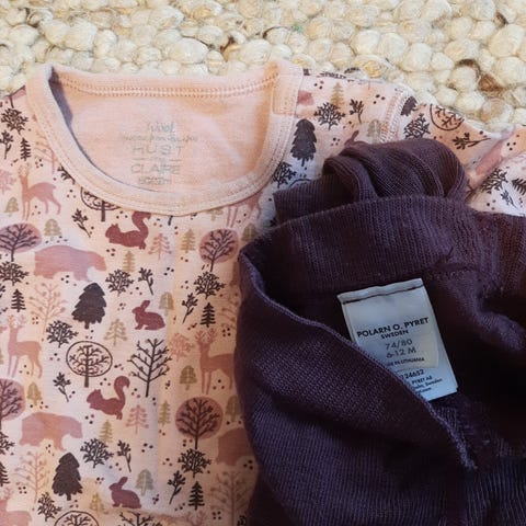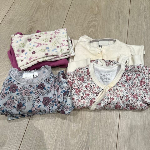 Barneklær i størrelse 74 for jente i rosa farge. Inneholder ulike plagg som bodyer, pysjamaser, kjoler og bukser i forskjellige rosa nyanser og mønstre, mye ull. Se bildene for mer info