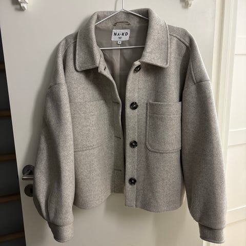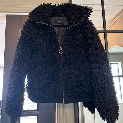 Kort, sort ytterjakke fra NA-KD i teddystoff. Jakken er i str 42, men er god og romslig. Kan fint ha tykk genser under og passer nok også en str 44.