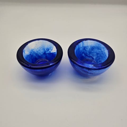 Kosta Boda lysestake i blått glass. Rund form med plass til telys. Laget av farget glass med en glatt overflate. Helt fri for skade og bruksmerker. Selges kun samlet.