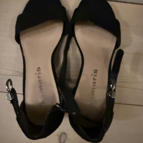 Tamaris Hæler for damer i størrelse 36. Skoene er svarte og har en åpen design med stropp rundt ankelen. Hælene er høye og tynne, laget for formelle eller uformelle anledninger.