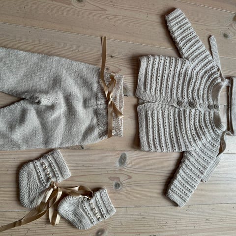 Hentesett som består av jakke, bukse, lue, sokker og tilhørende teppe selges.