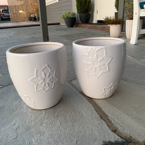 To høye blomsterpotter selges samlet. Kunstige blomster følger med. Den høyeste er 120cm den andre er 104cm. Må hentes.
