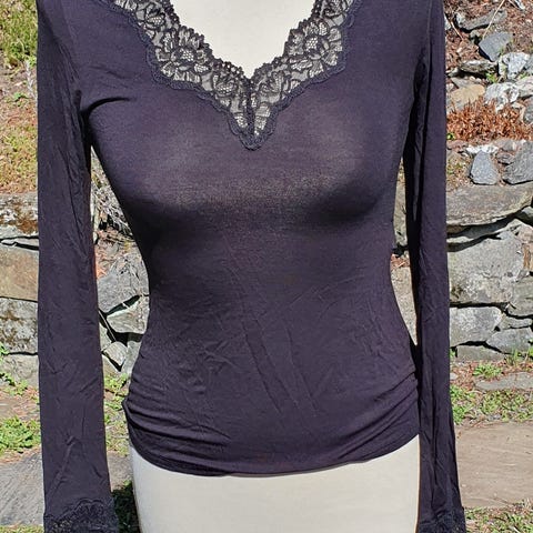 Nydelig svart genser med avrundet krage, dekorative blonder og knapper foran. Lange armer med en liten knyting. Myk, elastisk og behagelig å ha på seg.