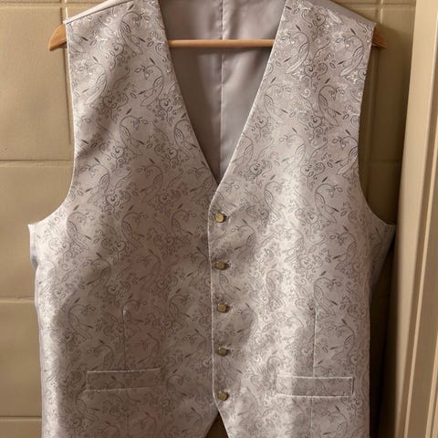 Selger en pent brukt bryllupsvest, kravatt og skjorte. Sendt på rens etter bryllupet. Str M. Den er sydd ut 3cm under armen.