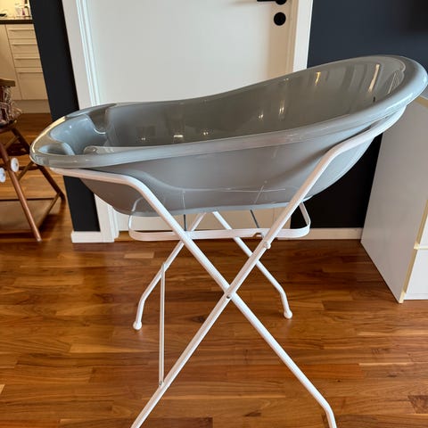Beemoo babybadekar i grå plast med hvitt stativ. Inkluderer badestol for nyfødte, som gir ekstra støtte og komfort under bading. Badekaret er designet for enkel bruk og stativet gir en praktisk høyde for foreldre under bading. Lite brukt da det har stått på hytta.