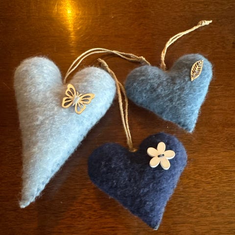 Tovad hjärtan, ett i blå/grå och en i röd/grå!
