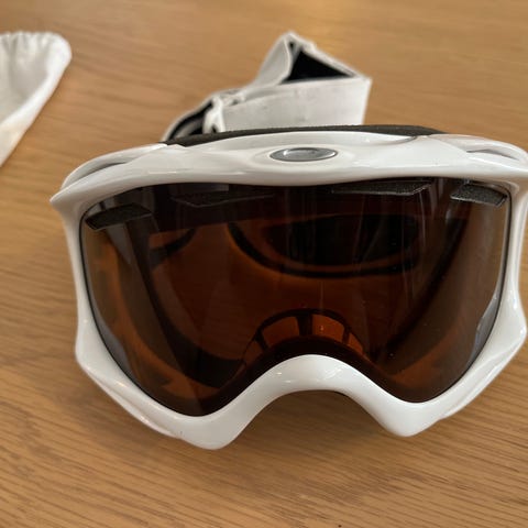 Oakley skibriller med stor linse i rød farge og svart ramme. Brillene har justerbar stropp med Oakley-logo, og skumfôret rundt kantene gir komfort og beskyttelse. Designet for å gi bredt synsfelt og god passform ved bruk med hjelm.
