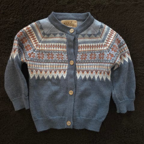 Cardigan fra MeMini i str 68. Antydninger til flekker. Vanskelig å få frem på bilde.